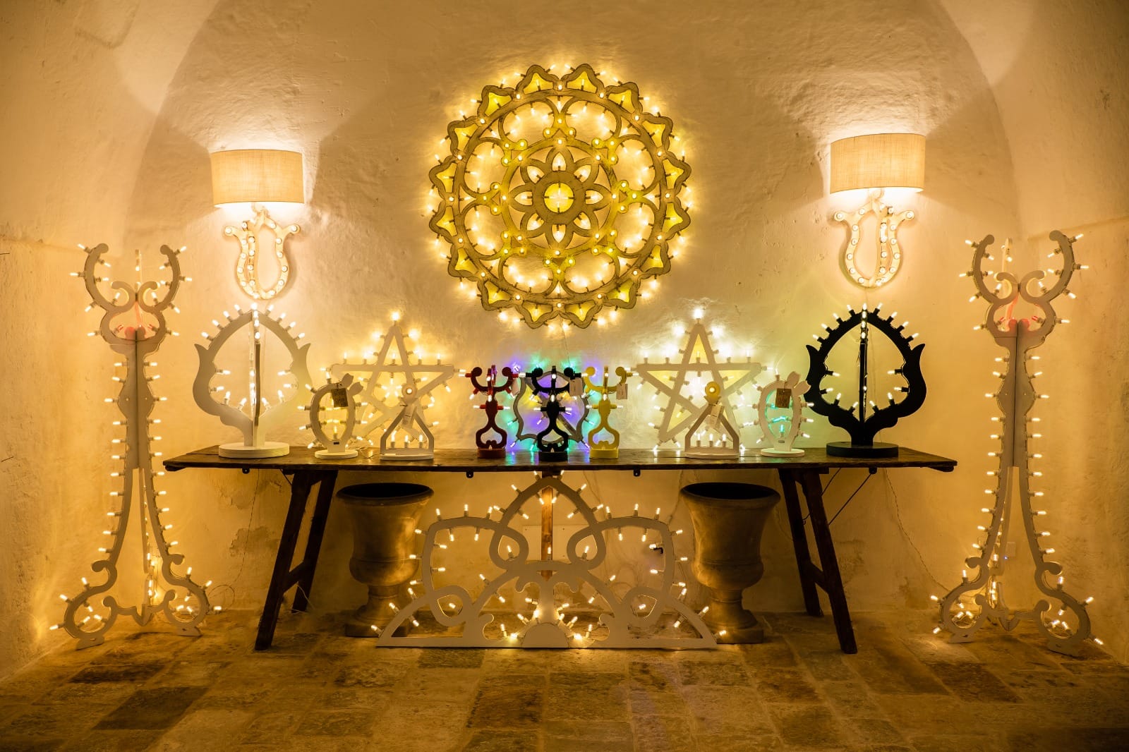 Questa esperienza si svolge nel laboratorio Lucciole di Puglia, situato nel centro di Fasano all’interno di un ex frantoio. Inizia con un aperitivo tradizionale pugliese, seguito da una introduzione storica all’arte delle luminarie. La parte pratica prevede la creazione di una piccola luminaria, a partire da una base in legno già dipinta. Ogni partecipante realizzerà il proprio pezzo da portare a casa.