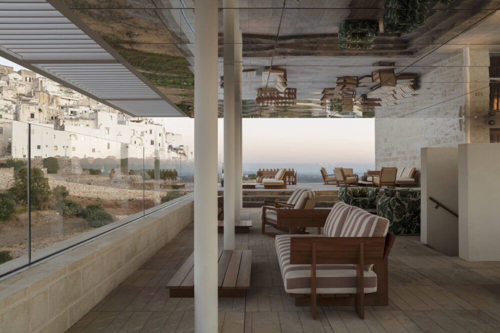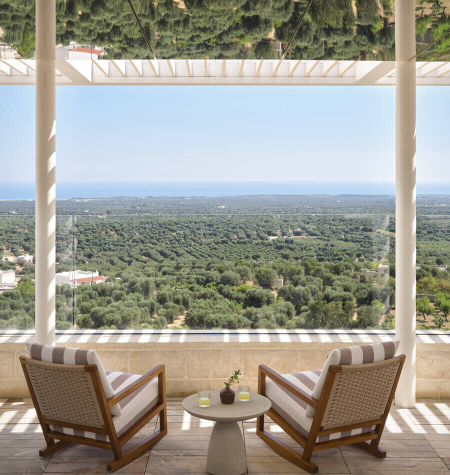 Durante il giorno, il Rooftop Bar è avvolto da una luce calda, con lo sguardo che si perde tra il mare all’orizzonte e la distesa di ulivi secolari a perdita d’occhio. Uno spazio che invita a sognare, dove ogni pausa permette di godere della quiete e della bellezza che lo circondano, con un servizio bar dedicato.